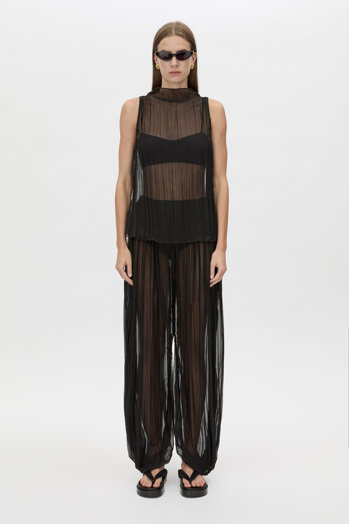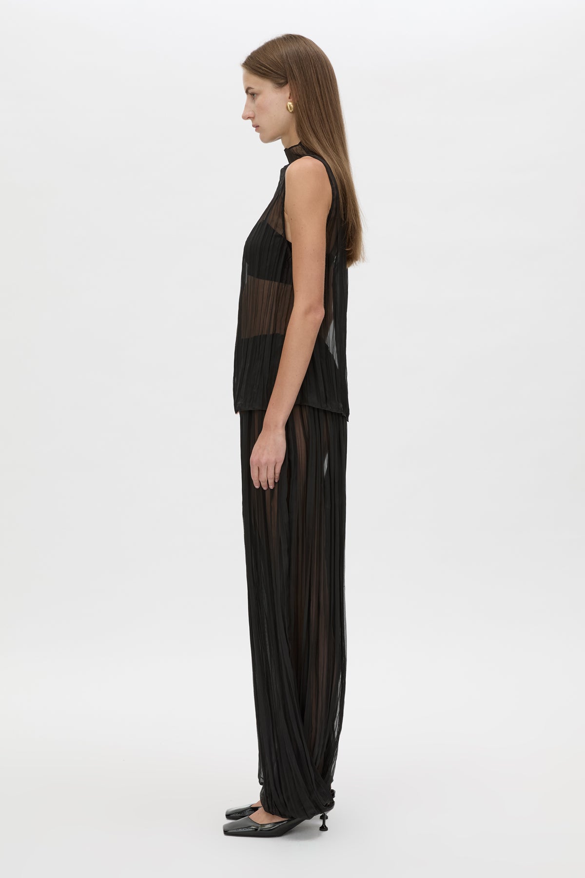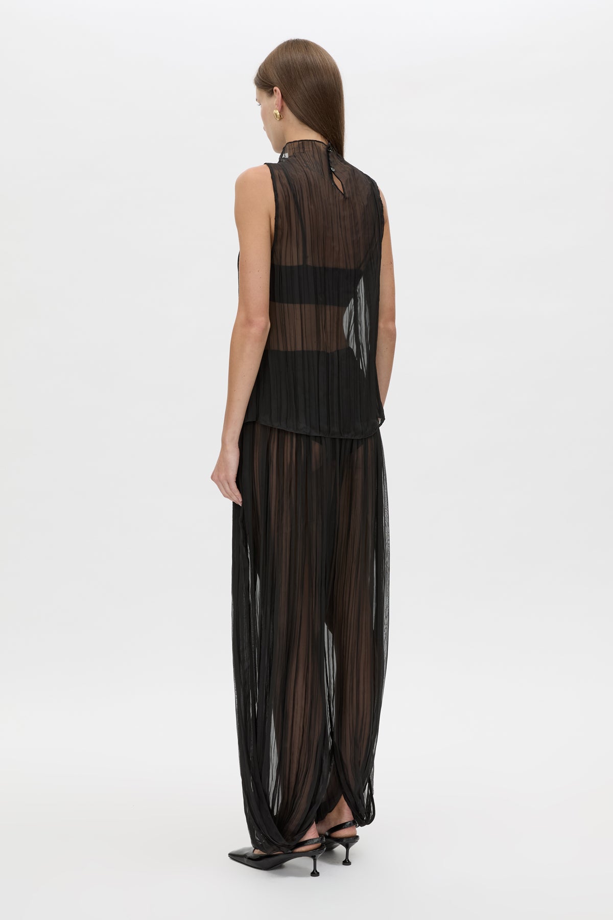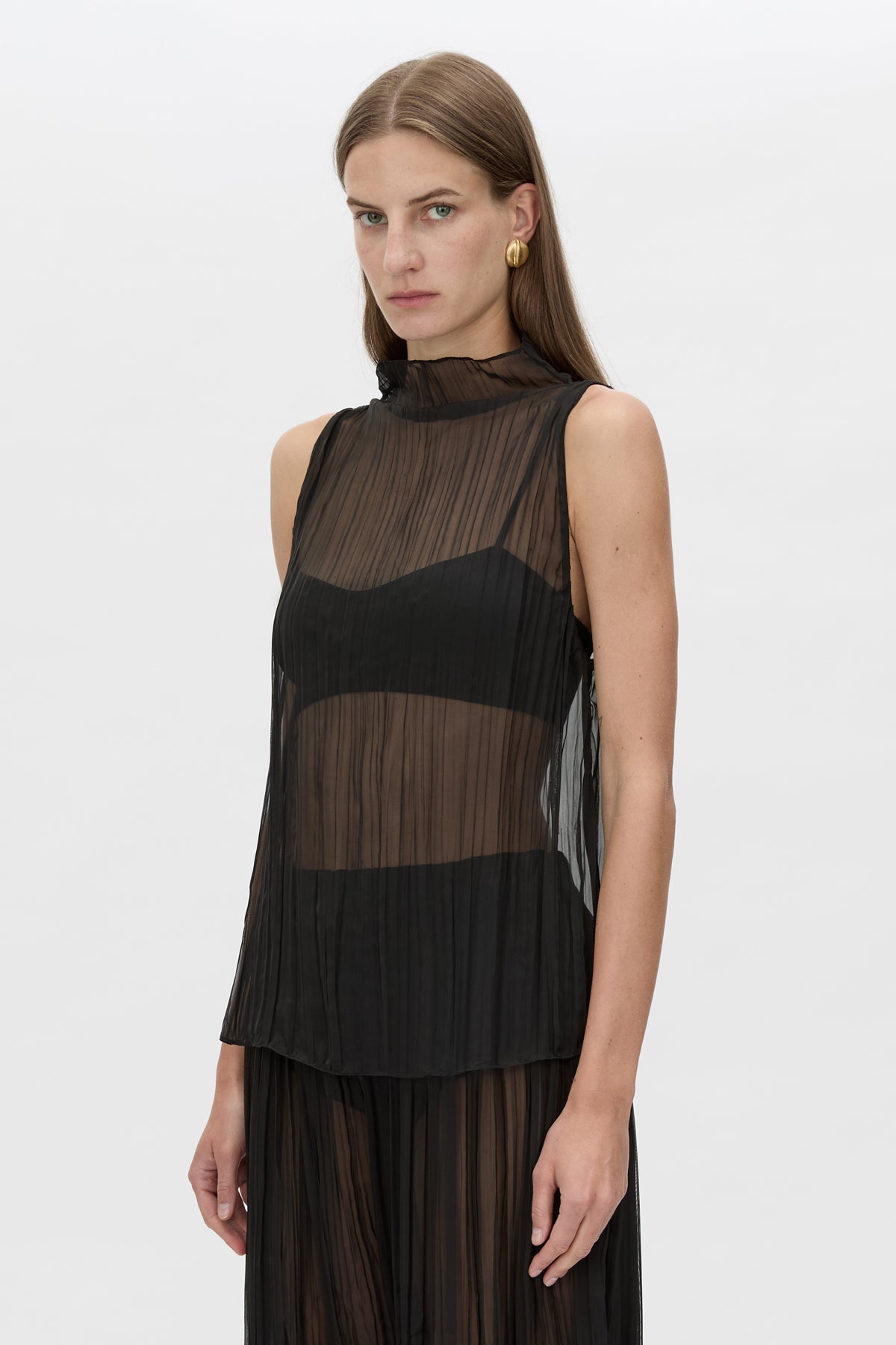 CAMILLA AND MARC Vento sheer high-neck pleated black top. Centre back keyhole with button closure, side seam splits.